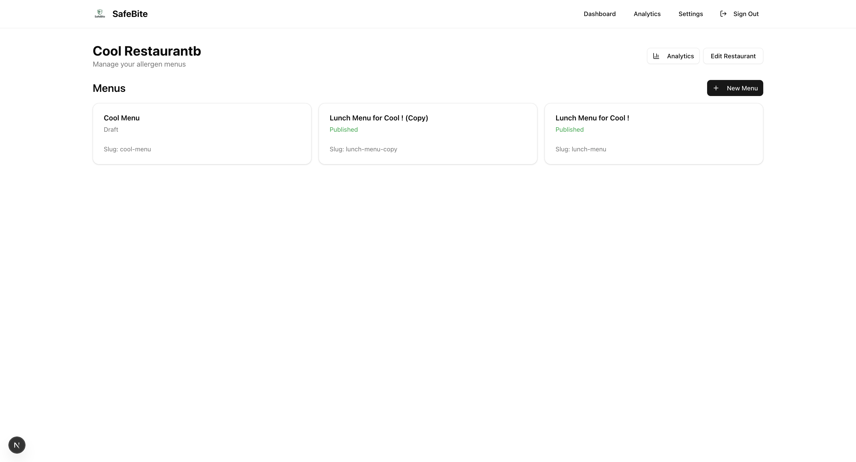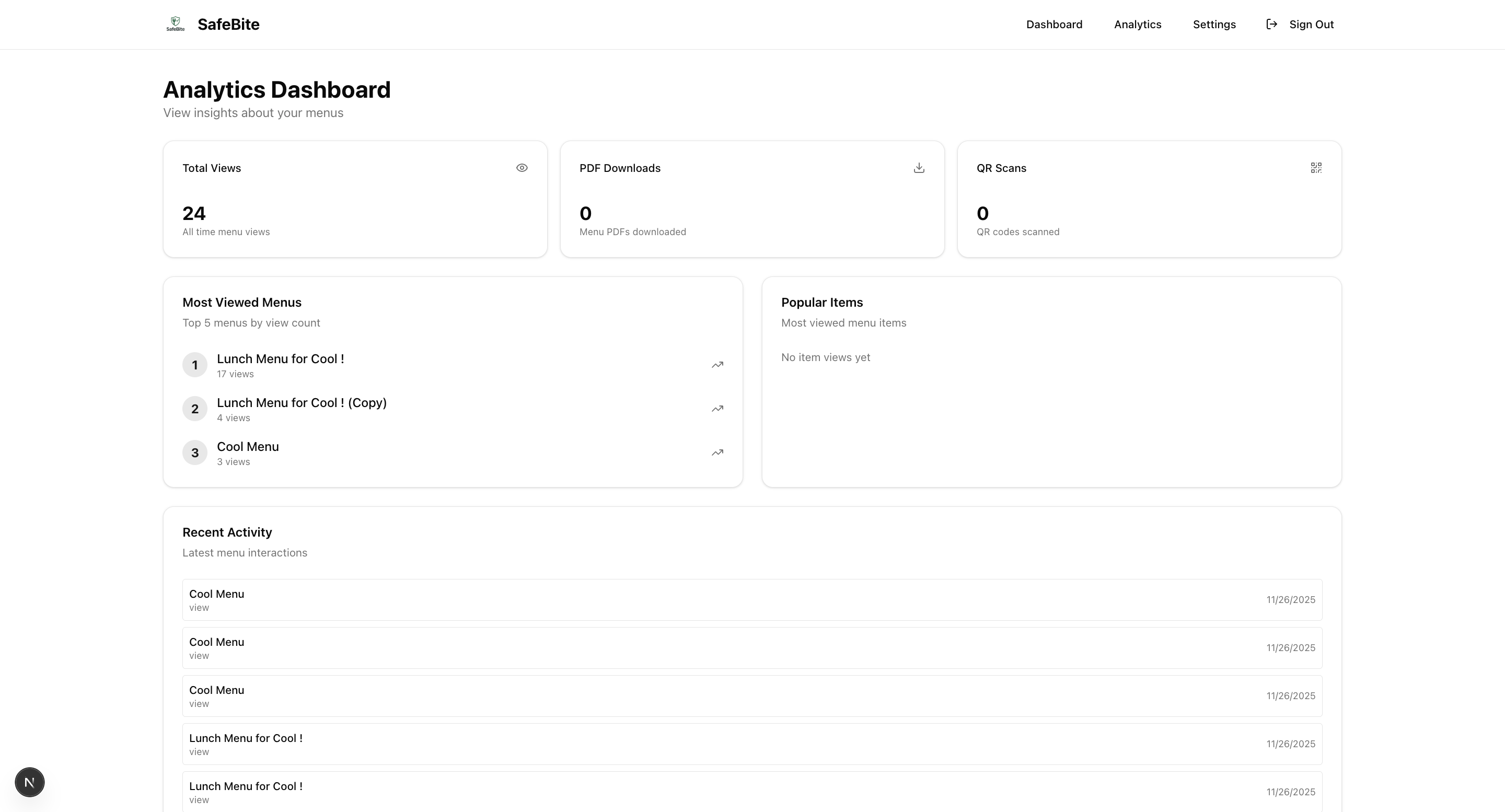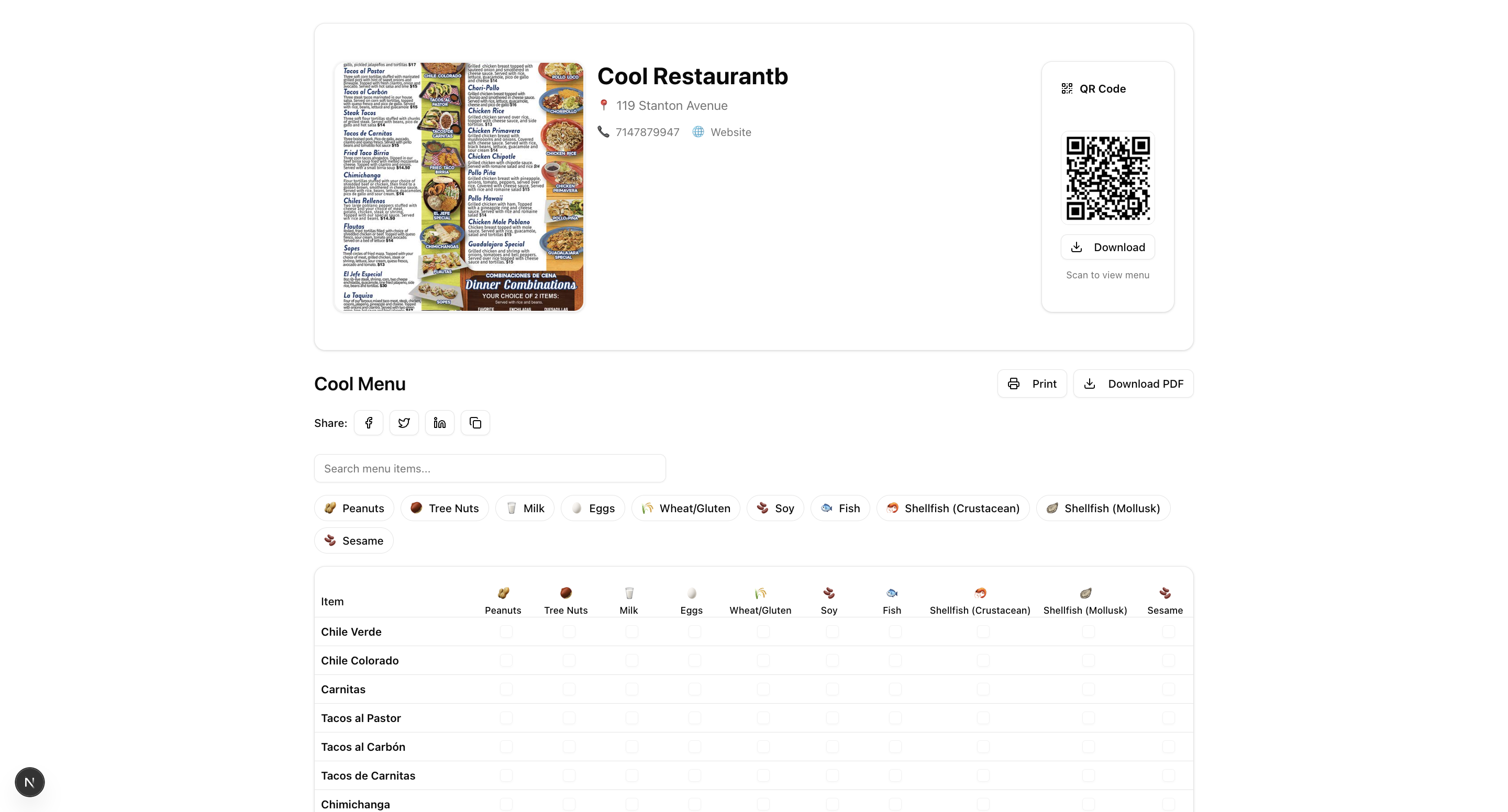 Publish your menu with one click and share the link or QR code. Customers can filter by allergens, find safe options instantly, and access your menu from any device—all while you track engagement with built-in analytics.