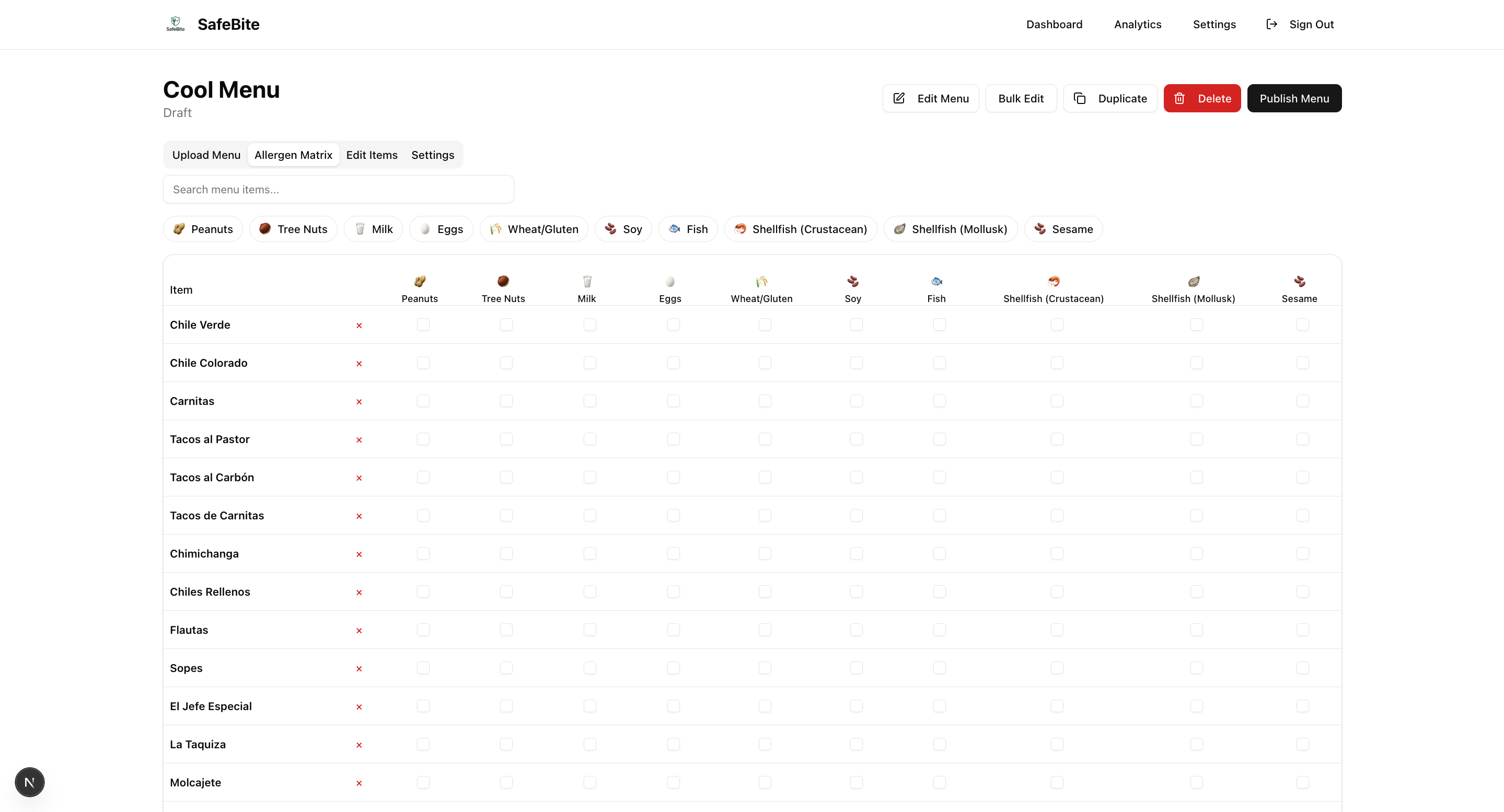 Review the extracted items and use our intuitive checkbox matrix to mark which allergens each item contains. Our AI can even suggest allergens based on ingredients, making the process even faster.